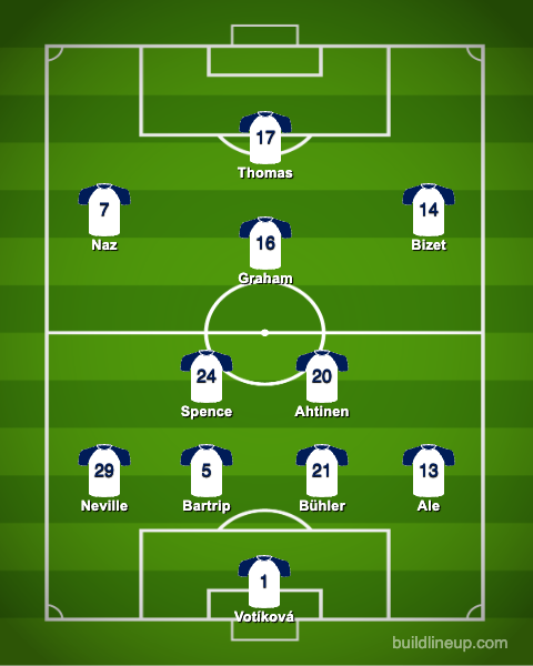 Although Shelina Zadorsky signed a contract extension for a further year at Spurs, expect her to be replaced in the starting XI with Bühler. I think Bühler and Molly Bartrip will make for a strong CB partnership, even if the fullback situation is up in the air. We don't know if Amy Turner is carrying an injury, but she didn't feature in the pre-season friendlies. There's also a bit of a wild card with young player Gracie Pearse staying with the team rather than going out on another loan. She could be an option at either centerback or right fullback. Otherwise, expect to see Neville and Ale getting the majority of starts on the flanks.