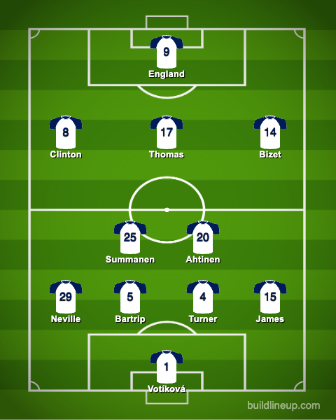 New signings would have to come off the bench for their debuts as Vilahamn put out a very strong team. Most notably, our Finnish double pivot of Eveliina Summanen and Olga Ahtinen were back in action for the first time in the WSL since their injury layoffs before the winter break. Beth England started just her third league game of the season, with Martha Thomas recovered from her minor hamstring injury to play behind her as the #10. The only real downside to the lineup was the exclusion of Luana BĂĽhler, who is still out with a persistent thigh issue. Amy Turner replaced her at right centerback to partner with Molly Bartrip. Meanwhile, Angharad James got another shift at right fullback after the experimentation in the FA Cup game.