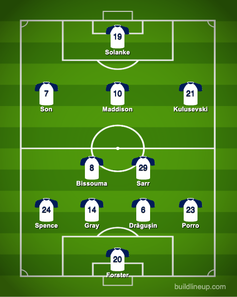 Maddison 1' • 45+4', Son 12', Kulusevski 14', Sarr 25'