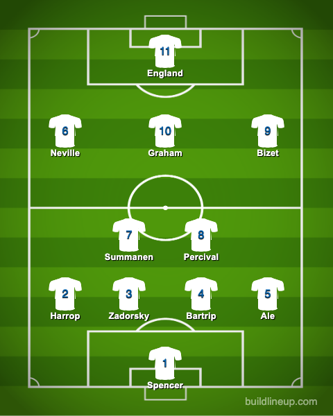 We ended up with a starting XI of Korpela in goal; Ale, Zadorsky, Bartrip, and turner in defense; James, Spence, and Cho in the midfield; Ubogagu and Ayane on the wings; and Beth England as striker. I was delighted to see Beth starting on her debut, and she did not disappoint.