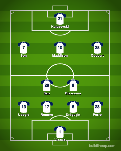 With Arsenal missing two key midfielders, we have no excuse not to win the midfield battle. That being said, I still don't even know who my personal preferred midfield three is this season, although I think James Maddison has to be a lock for this particular fixture from an experience standpoint. I slightly give Pape Sarr the edge over playing Lucas Bergvall or even Dejan Kulusevski in his place, but mostly because I would like to have the two of them available as impact subs when Sarr inevitably tires out around the 65th minute. Sarr's pace will be valuable on the defensive side of things, and I think we'll have enough creativity further up the pitch with Maddison and the wingers, especially since Arsenal won't be playing a low block. That just leaves the #6 conundrum. It could be a moot point if Bissouma ends up being unavailable; Rodrigo Bentancur would be the natural choice then with his seniority. I can't see Ange throwing Archie Gray into the NLD cauldron unless it was by necessity.
