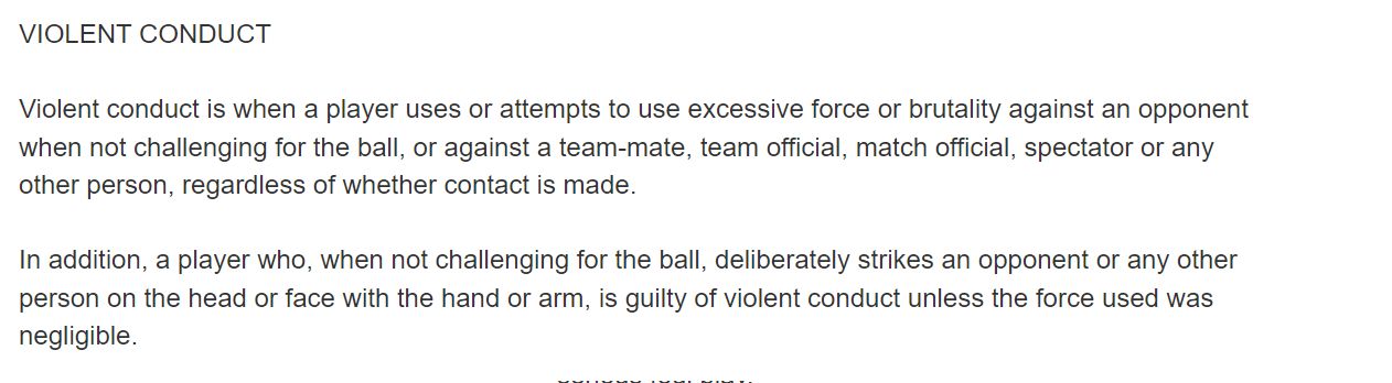 • The nature of her reaction fits the definition of violent conduct as laid out in the FA rulebook, despite not rising to the level of the worst infraction, which involves contact with an opponent's head. It meets both parts of the criteria—excessive force (this comes through really clearly on the video replay), and not challenging for the ball. Crucially, contact does not even have to be made for it to count as violent conduct; only an intent to make contact is required. In this case, Toone did indeed make contact with her opponent who was in a vulnerable position on the ground, and possession of the ball was no longer in contention.