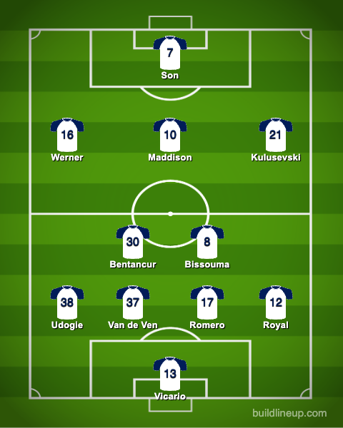 Ange Postecoglou had two major injuries to deal with. Emerson Royal got another start in place of Pedro Porro, while Son Heung-min returned to the striker spot in Richarlison's absence. Timo Werner got another start as a result of Son shifting to the center, while Rodrigo Bentancur got the nod over Pape Sarr.